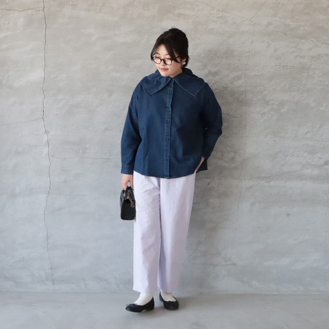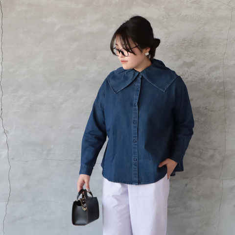 存在感のある襟デザインが目を惹く綿麻デニム ビッグカラーシャツ