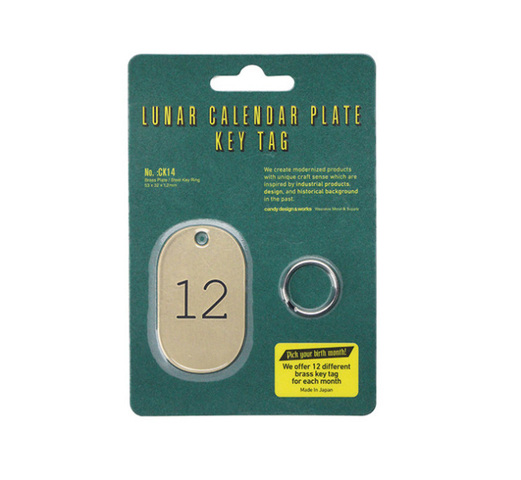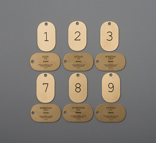 睦月、如月、弥生などの1月から12月までの太陽暦の月の呼び名を刻印した真鍮製のキータグ。