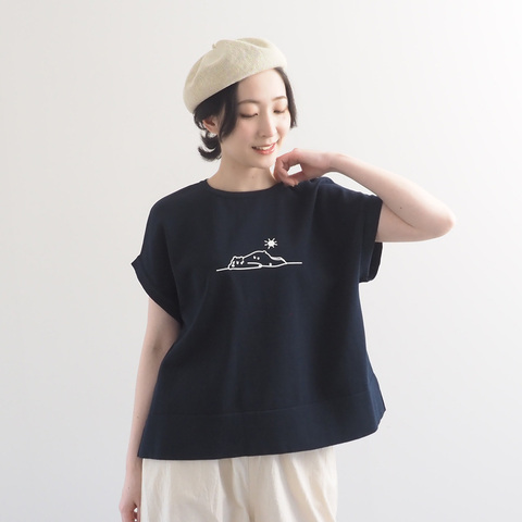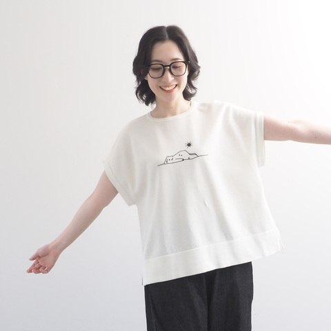 夏バテのくまちゃんのイラストが、見るたびにほっとする可愛らしさ。ニットなのに軽やかな素材で、見た目も着心地も涼やかに仕上げました。