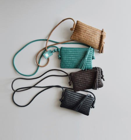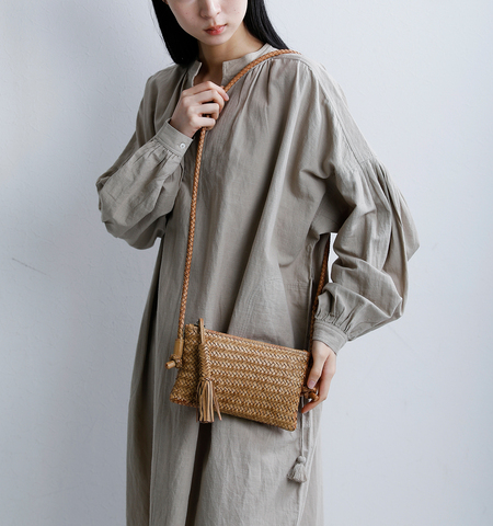 洗い加工を施した、柔らかなタンニンカウレザーを、丁寧に編み込んだクラフト感のある素材。使い込むほどにレザーの風合いが深まり、自分だけの表情へと育っていくのも魅力のひとつです。