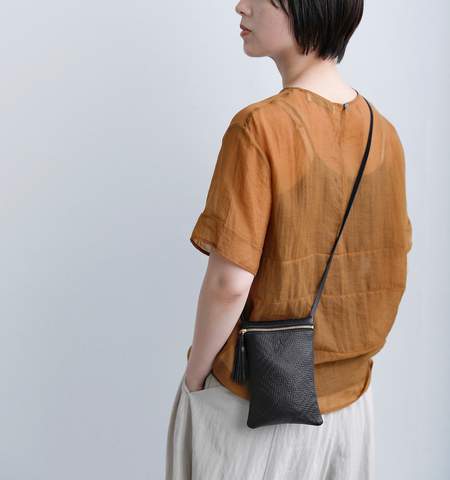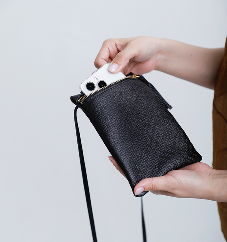 上質なカウレザーに、さりげない型押しを施したショルダーポーチ。ほのかに浮かぶ模様が、シンプルな中に静かな表情を生み出します。無駄を削ぎ落としたデザインは、中に入れるものを選ばず、日常のあらゆるシーンに自然とフィット。コンパクトながら肩掛けできる軽やかなフォルムは、身軽なおでかけに活躍。
