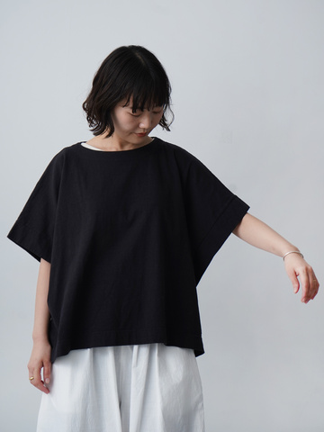 ポンチョのような広がりのあるシルエットのTシャツです。サイドには深めのスリットが入り、ひらりと動く揺れ感が軽やかな雰囲気に。個性のあるかたちですが、無地で装飾のないシンプルさが手に取りやすい一着です。