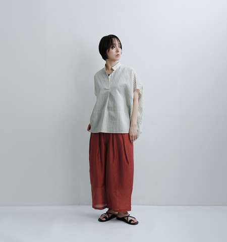 生地表面は、細かな織りによってほんのりとした艶があり、光の当たり方で表情が変わるニュアンスのある風合いが特徴。いわゆるカジュアルなリネンとは違い、ラフすぎず、きれいめな印象をキープしてくれます。