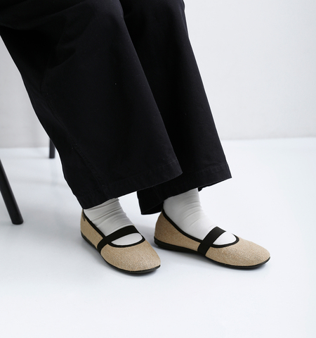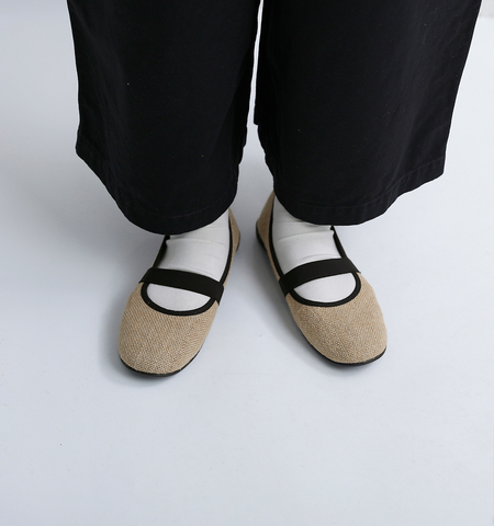 バレエシューズをベースに、アッパーには風合い豊かな天然素材を使用。足にやさしく馴染む軽やかな履き心地で、さっと気軽に取り入れられる一足に仕上げられています。