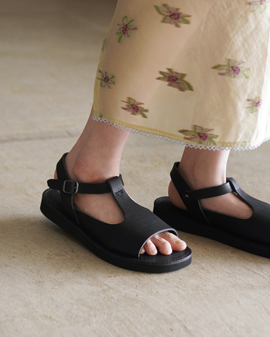 Tストラップが足元をすっきりと美しく見せ、フェミニンなスタイルにぴったりのデザイン。マットな質感のオイルレザーが上品な印象を与え、カジュアルにもきれいめにもマッチします。
