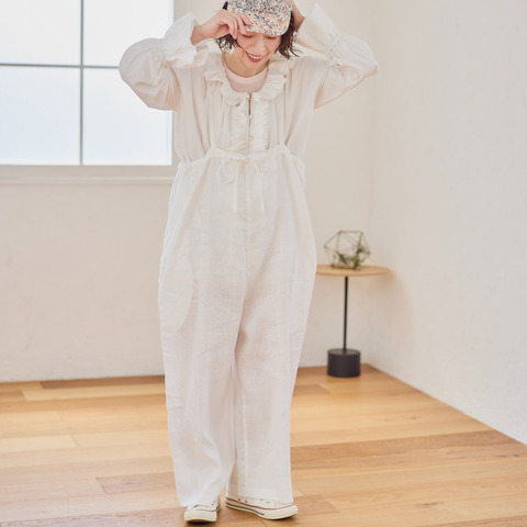 今回のコレクションは、フリルブラウスとリネンサロペットの2アイテム。