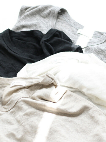 リネン100%の織物はよく見かけますが、糸切れしやすく編み立てるのが難しいリネンを、他の素材を交ぜる事なく、和歌山のメリヤス工場でゆっくりと丁寧に編み立ててつくりあげたカットソー素材(編み物)のプレミアムリネン®。リネンならではの、さらりとした風合いで、素肌に着ると非常に心地よい。また、吸放湿性に優れているので、汗をかいても爽やかさを持続。風通しもよく真夏でも蒸れにくく非常に涼しく着ていただけます。「着て」「洗濯」を繰り返す度に、風合いも柔らかく馴染んでいきます。そんなプレミアムリネン®を是非お試しください。