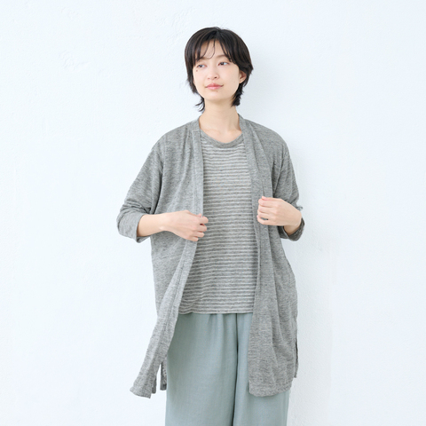 さらさらリネンで日差しをガード。プレミアムリネンが叶える、着て涼む、紫外線対策。とにかく涼しい着心地が人気のプレミアムリネンのカーデ。今回は、身丈を少し長めにつくり、ボタンなしの着流しスタイルのサッと羽織れるカーデに仕上げました。風通しよく、さらりとした肌触り、吸放湿性に優れたプレミアムリネンだから、暑い季節に日除けとしてこの上なく快適な着心地。他にも室内での冷房対策、旅先で肌寒い夜に、何かと活躍してくれる一枚です。