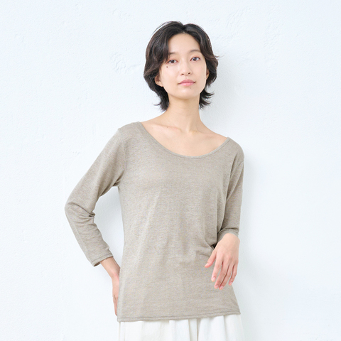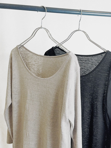 リネン100%の織物はよく見かけますが、糸切れしやすく編み立てるのが難しいリネンを、他の素材を交ぜる事なく、和歌山のメリヤス工場でゆっくりと丁寧に編み立ててつくりあげたカットソー素材(編み物)のプレミアムリネン®。リネンならではの、さらりとした風合いで、素肌に着ると非常に心地よい。また、吸放湿性に優れているので、汗をかいても爽やかさを持続。風通しもよく真夏でも蒸れにくく非常に涼しく着ていただけます。「着て」「洗濯」を繰り返す度に、風合いも柔らかく馴染んでいきます。そんなプレミアムリネン®を是非お試しください。