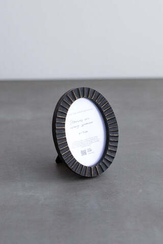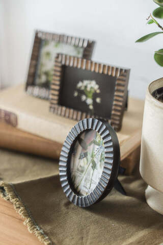 放射状に並ぶリブが、オーバル型のフレームをぐるりと縁取る。18世紀フランスのオーバル額から着想を得た、アンティーク風のフォトフレームです。飾る写真やカードを、まるで大切な宝物のように包み込んでくれます。