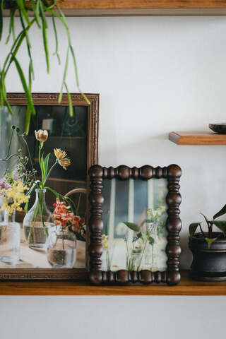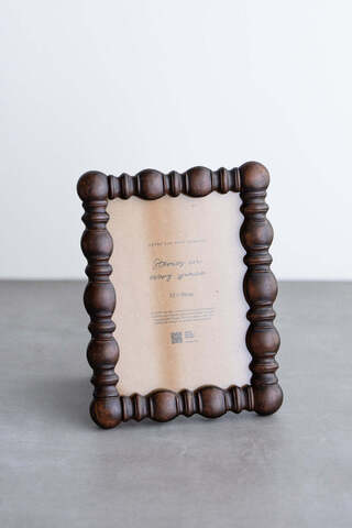 ろくろで削り出したような、丸みのあるパーツが連なるフレームデザインが印象的なフォトフレーム。柔らかなフォルムがリズミカルに並び、どこか温もりのある立体感を生み出します。