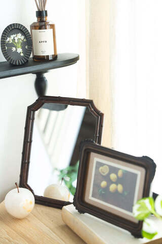 繊細な装飾や陰影を美しく表現しているのは、レジン素材ならではの魅力。木製と見紛うほど精巧に仕上げられたフレームは、温かみとアンティークフレームのような重厚感をあわせ持ち、クラシカルな空気をやわらかく取り入れることができます。