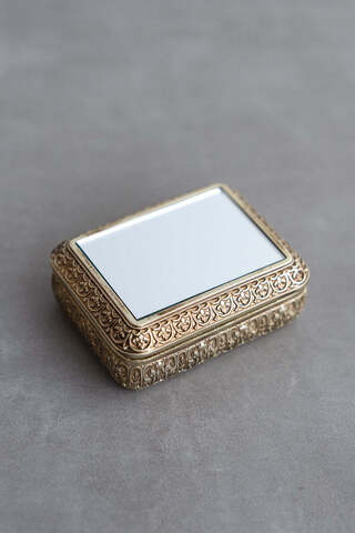 繊細な装飾がぐるりと施された、アンティーク調のミラー付き小物入れ。まるで時を経たヴィンテージのような佇まいで、デスクやドレッサー、シェルフの上にさりげなく置くだけでも空間にクラシカルな雰囲気を添えてくれます。