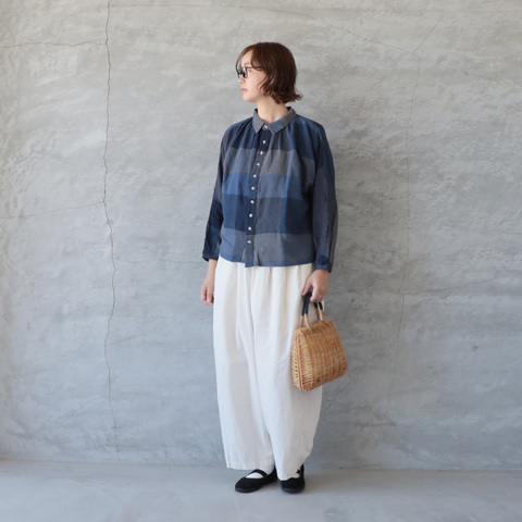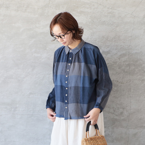 存在感のある大きめチェック柄が目を惹くビッグチェック綿麻ブラウス