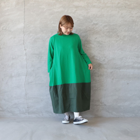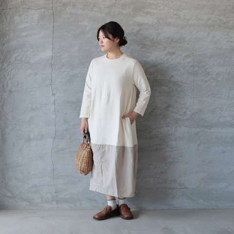 トップ部分はやわらかなカットソー素材、スカート部分は程よくハリのある布帛素材で切り替え、1枚で着映えするデザインに仕上げました。