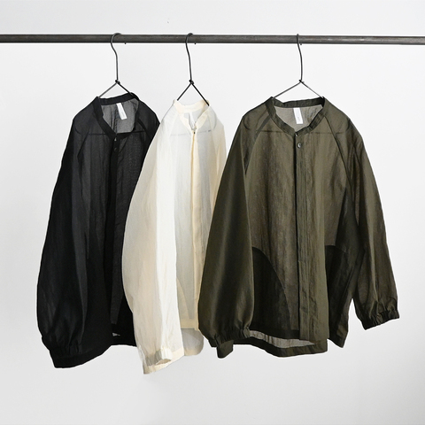 こちらは、シアーコクーンブルゾン。生地は軽さと紙のようなパリッとした独特のハリ感が特徴の「ペーパーリップストップ」生地を使用しています。ナイロン特有の美しい透け感がありインナーとの重なりで奥行きのある色表現を楽しめます。肌離れの良いドライなタッチと、ナチュラルなシワ感が魅力です。
