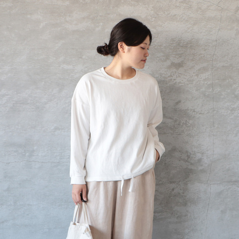 裾のドローストリングがアクセントになったドロスト切替デザインプルオーバー