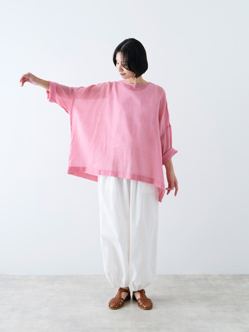 透明感のある爽やかな雰囲気のプルオーバー。非常に細いラミー(麻の一種)の糸を使用していて、軽くて涼しい着心地です。麻ならではのナチュラルな雰囲気のシアー感なので、お手持ちの服とも合わせやすいです。
