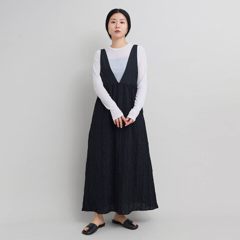 深Vネックのすっきりしたデザインと裾のボリュームのメリハリのあるバランスに仕上がったノースリワンピース。