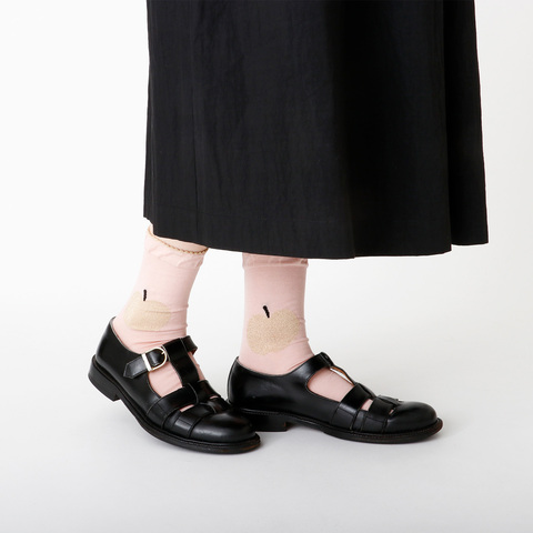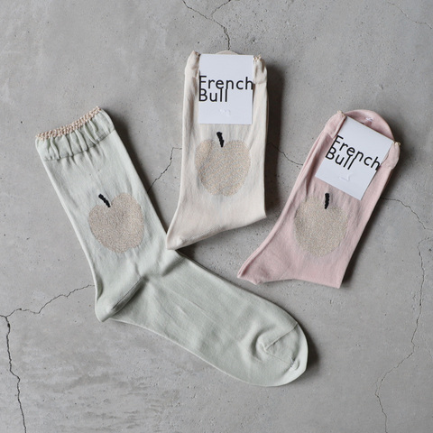 りんごモチーフをゴールドのラメ糸で、洋梨モチーフをモノトーン柄で表現したソックスです。