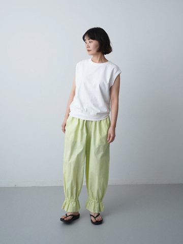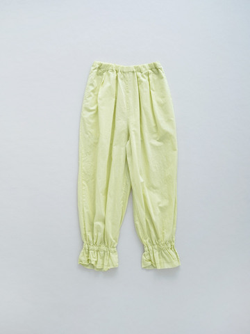 キャンディの包み紙のような、きゅっと絞られたかたちが特徴的なパンツです。足首より少し上の位置にゴムが入り、その先に広がるフレアが華やかな印象に。ゆったりとしたつくりですがワイドすぎないので、ワンピースのインナーパンツとしてもおすすめです。