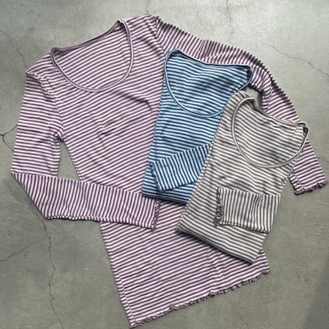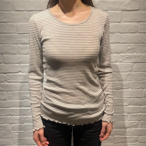 何かと合わせやすい細めのボーダー。袖口と裾はメロウフロルデザイン。カジュアルさを残しながら、甘くなりずぎず程よい女性らしさを演出してくれます。1枚ではもちろん、インナーとして着用した際に袖口や裾のフリルがチラリと見えてもステキです。カラーバリエーションはサンド(ベージュ)・ブルー・ピンクの3色展開です。