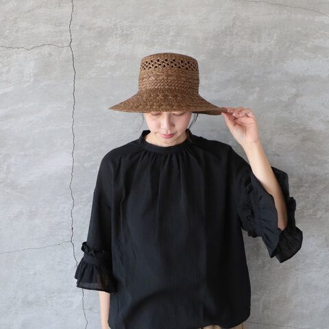 やや広めのブリムは日差しをやさしく遮りつつ、顔まわりをすっきりと見せてくれるバランスの良いシルエット。シンプルな中にも編み地の変化がアクセントとなり、普段のコーディネートにさりげないニュアンスをプラスします。