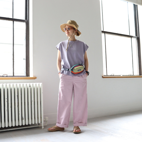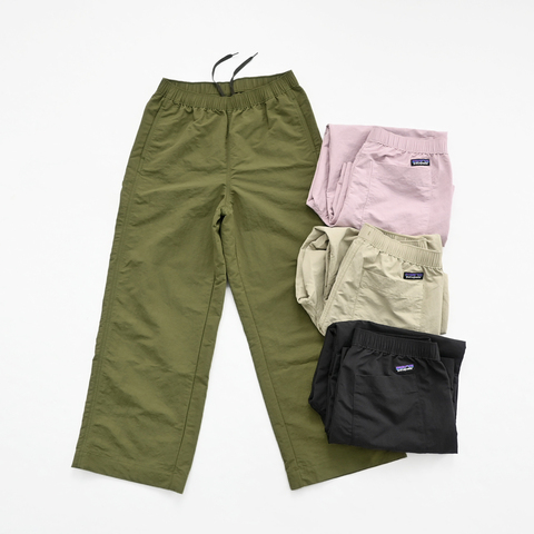 こちらは、ウィメンズ・アウトドア・エブリデー・パンツ。生地は漁網をリサイクルして海洋プラスチック汚染の削減に貢献する、速乾性を備えた軽量なネットプラス・ポストコンシューマーリサイクル・ナイロン100%素材。やや薄手ながらもハリ感と柔らかさを併せ持っていて、サラリとした肌触り。真夏も快適な生地感です。