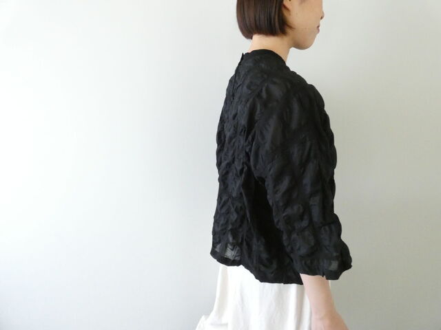 部分的に縮ませることで生まれる凹凸感が特徴で、シワのような自然な立体感があり、無地とはひと味違った奥行きのある表情に仕上がっています。