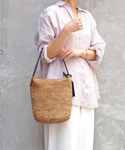 ・ラフィアは自然素材を使用している為、色味は若干の個体差がございます。また、摩擦、汗や雨などによる水濡れによって色落ち、色移りの恐れがあります。白色や淡色のものと組み合わせる際は、製品のお取り扱いに十分にご注意ください。