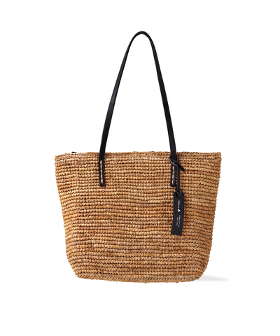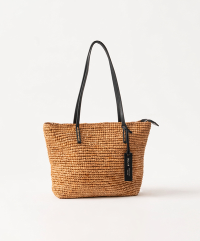 ブラックカラーのレザーとラフィアの素材の組み合わせが、ナチュラルながらも品の良さも兼ね備えた雰囲気のバッグです。