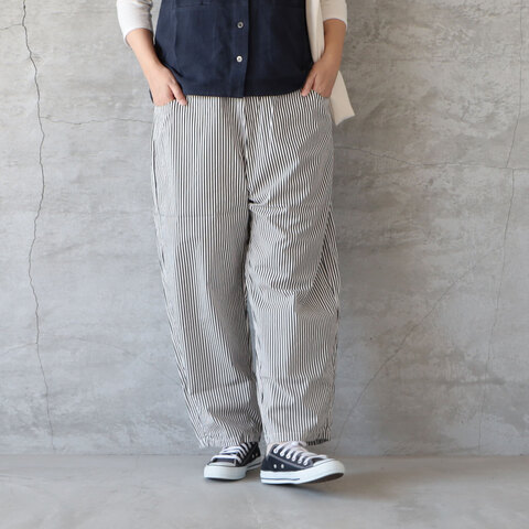 爽やかな白黒ストライプが目を惹く、NARUのブロードストライプノッポパンツ 。