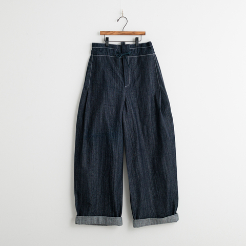 コクーンワイドパンツ(PT-1)は、ポケット近くに大きなタックをつくることで生まれる、立体的なサイドのカーブが印象的なデニムです。