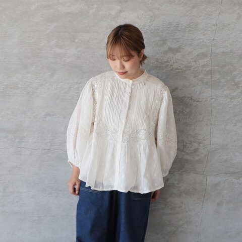 繊細なカットドビーとレース刺繍を組み合わせた表情豊かなスタンドカラーシャツ