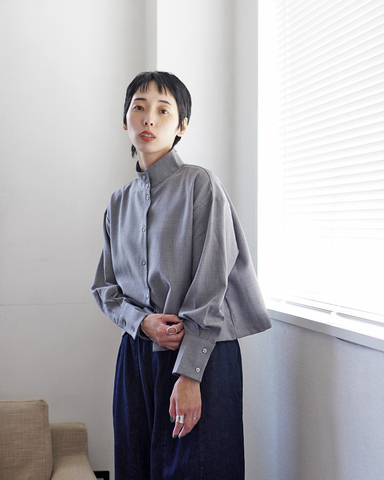 上品なグレーのスタンドカラーシャツが顔まわりを引き締め、きちんと感と凛とした雰囲気を演出。ボタンを上まで留めることで、端正なムードが際立ちます。