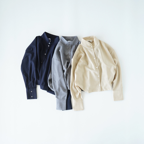 スタンドカラーと長めのカフスがきちんと感をプラスしつつ、重ね着もしやすいデザインに仕上げています。