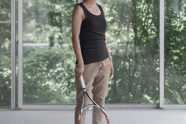 シャツ:リネン切替シャツ サンダル:日田サンダル