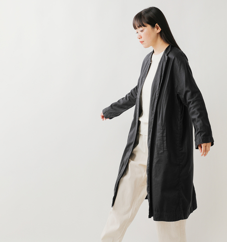 袖の付け根に切り替えがなく、手を広げると矢の様なラインになる事から名付けられたアローコート。着て頂くと生地が肩に沿い、綺麗なシルエットを作ってくれます。後ろには深めのスリットが入っており、動きやすいデザインです。裏地のない軽い着心地で、アウターとしては季節の変わり目に丁度よい生地感です。寒い季節には、室内での羽織りにおすすめです。色違いで揃えても重宝する1着です。 今回より袖巾を広げ、肩回りにゆとりを追加しました。