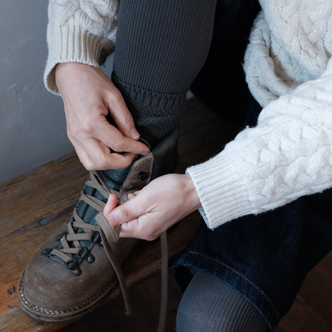 五倍子染めの糸を使用した、リブ編みのベーシックレギンスです。平編みよりも少し肉厚でしっかりあたたか。