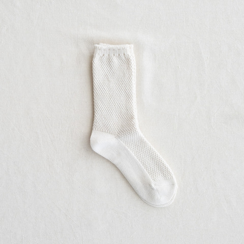 生地に凹凸があり通気性に優れている鹿の子編みのソックスです。鹿の子編みの表情が特徴的で、爽やかな履き心地の1枚です。