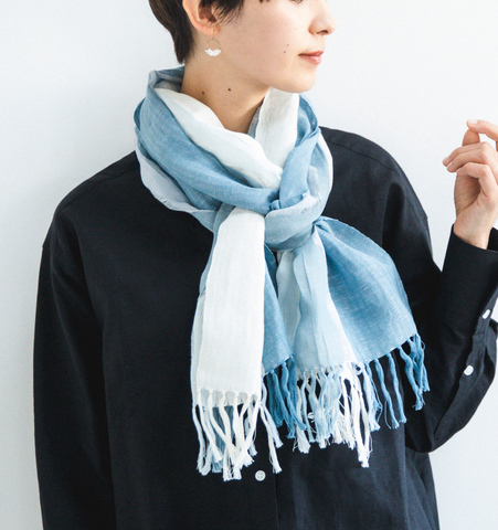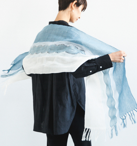 さりげなく見えるよろけ模様が、独創的かつ上品さを感じさせます。綿麻の質感と薄地の生地感が「よろけ織り」と合わさることで、まるで清流のような、透明感のあるストールに仕上がりました。