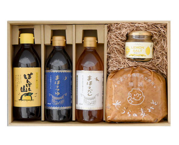 ■Bセット:ぽんぽん山 360ml×1本、まほうつゆ 360ml×1本、まほうだし 360ml×1本、熟成塩レモン 120g×1個、光うらの麦みそ 1kg×1袋