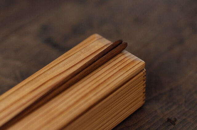 箸先がとても細いから細かいものまで楽につまめ、それでいて、削り跡をそのまま残しているからすべりにくいのが特徴。無塗装仕上げのため、使いこむうちに深い色合いに変化していきます。