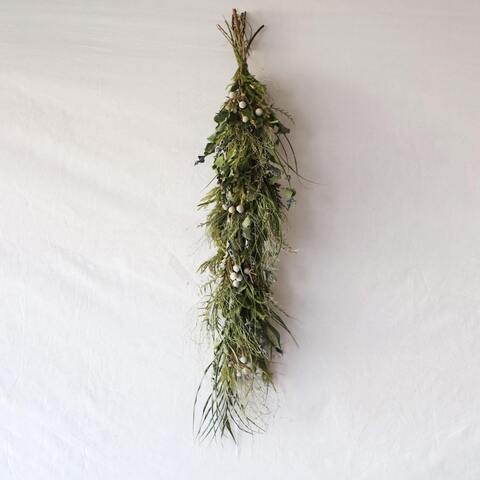 いろんなグリーンをミックスしてお作りした、縦長のスワッグです