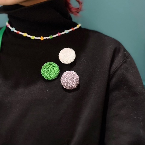上からORBブローチ シルバーベル,MARKブローチ ホワイト、グリーン