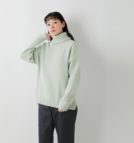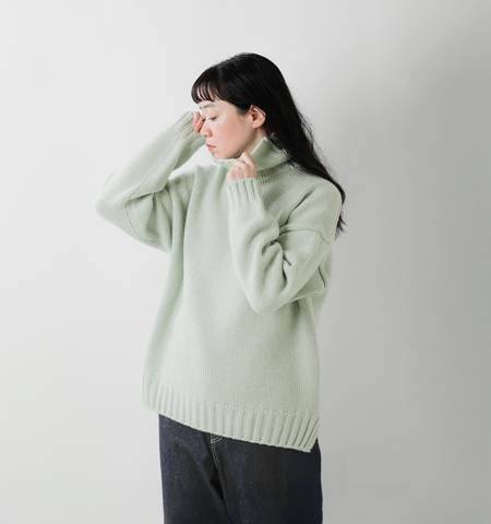 タートルネックで上品な印象を与え、ゆったりとしたシルエットがリラックスしたムードに。ジーロンラムとカシミヤのミックスニットが生み出すふっくらと柔らかな肌触りと暖かさが秋冬のデイリーにマッチ。とてもシンプルなデザインながらも、メリハリを効かせた拘りのあるシルエットで、様々なアイテムにバランス良く合わせられます。