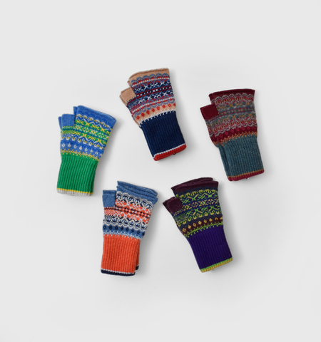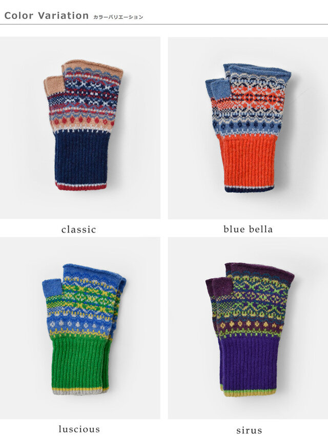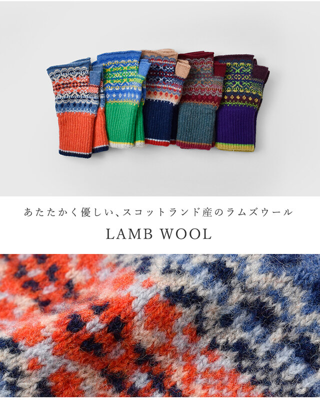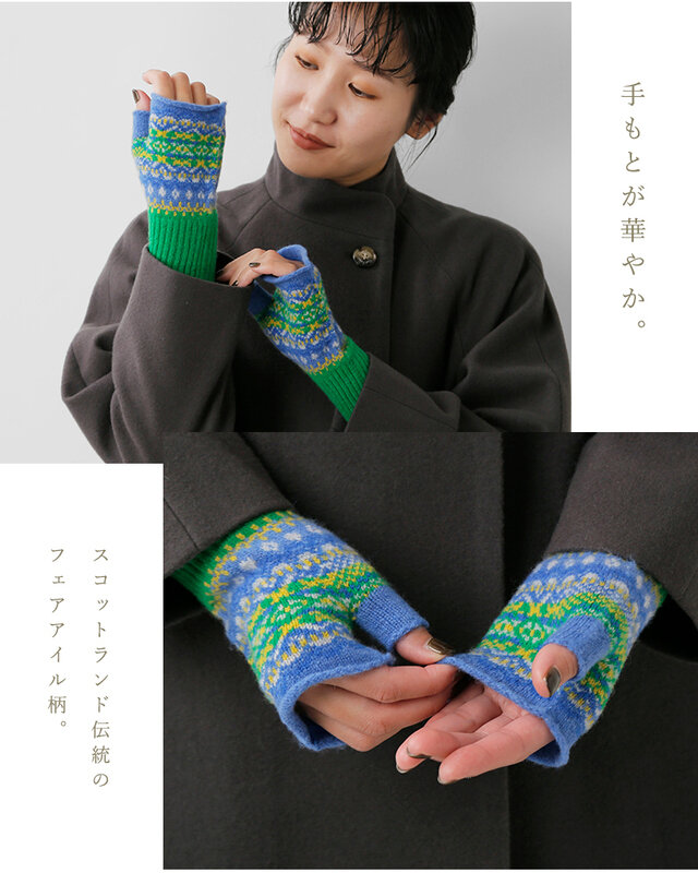 スコットランド伝統のフェアアイル柄を、多彩な編み地と独創的な色使いで表現するエリベの手袋。スモーキーでシックな配色が美しく、冬の装いに暖かな彩りをプラスします。指先が出るオープンタイプの手袋で、スマートフォンの操作がしやすいです。柔らかくふんわりとしたウール100%のニットは発色も美しく、冬の装いの華やかなポイントになってくれます。