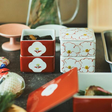 椿の花をあしらった有田焼のお重。おかずや料理を盛り付ければ、手軽にお正月気分が味わえます。ひとつひとつ丁寧に手作業で絵付けされていて、温もりや質の良さも感じられる器です。