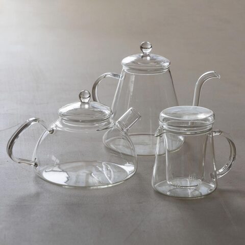 フタや持ち手まで全てガラスでできたポットやケトルは、シルエットやガラスの表情が美しく、実用的に使いながら、テーブルやキッチンの風景をちょっと特別に変えてくれます。