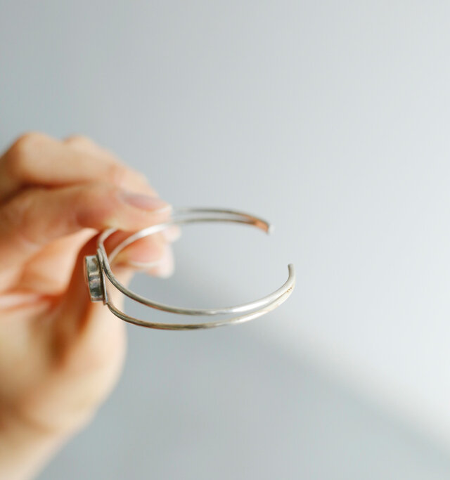 本物の花が使われていて、繊細な押し花の表情に心惹かれる1点もののブレスレットです。華奢な2本のメタルに大きめのモチーフが置かれ、手元の程よいアクセントにもなってくれます。